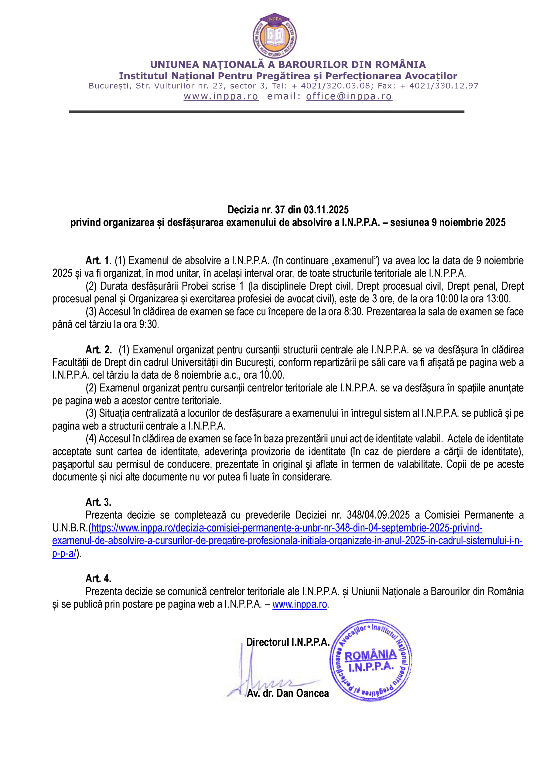 Decizia nr. 37 din 03.11.2025 privind organizarea și desfășurarea examenului de absolvire a I.N.P.P.A. – sesiunea 9 noiembrie 2025